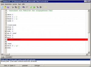 Zu sehen ist MiniAsm32 0.3 mit einem Programm zur Errechnung der Fakultät(das verwendete Befehlsschema wurde mittlerweile durch ein anderes ersetzt). Die IDE hat einen Syntaxfehler erkannt und rot markiert.